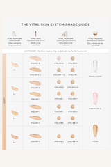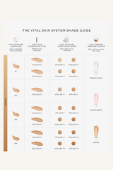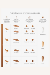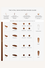 Vital Skincare Concealer har anderledes farvekoder end Vital Skincare Complexion Drops og Vital Skin Foundation Skin. Den er ikke inddelt i undertoner, men i stedet i fire hudtoner; Light (L), Medium (M), Tan (T) og Deep (D) med hver fire underkategorier, hvor 1 er lysest og 4 mørkest. Du kan se, hvilken farvetone, der matcher dig, ud fra kortet på billederne